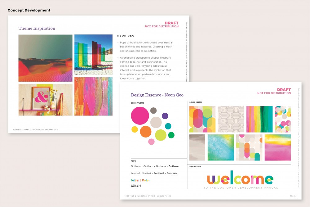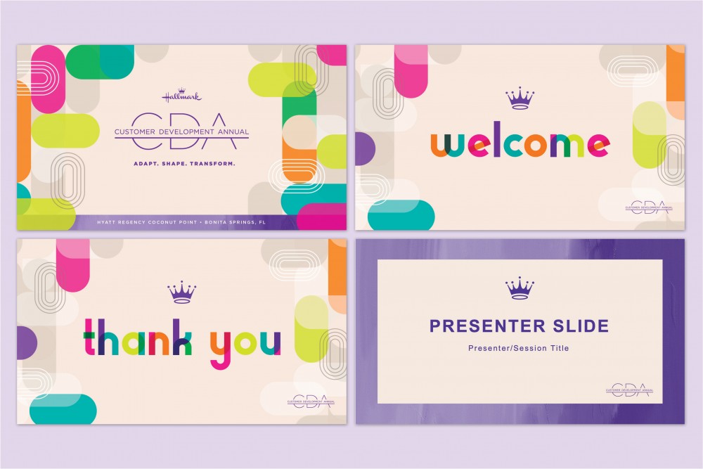 For the meeting in Fort Myers, the event team needed a fresh design system for this year’s event that worked seamlessly across print, digital, environmental displays, and attendee gifts, while remaining anchored to the CDA wordmark. I was inspired by beach landscapes juxtaposed with bold pops of color. The bold colors emphasized the energy and boldness leadership was hoping to bring to the meeting to re-energize employees. To keep costs low, I was able to strategically design signage and other materials in an elevated way but still within the constraints of the internal print center.