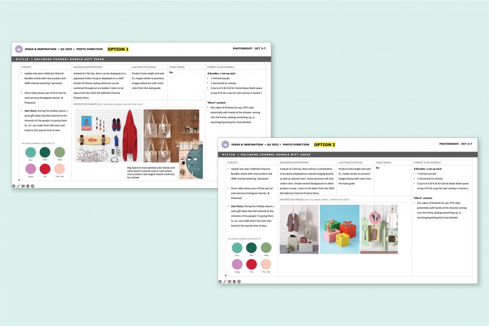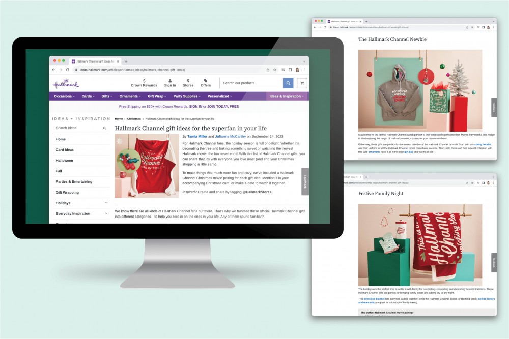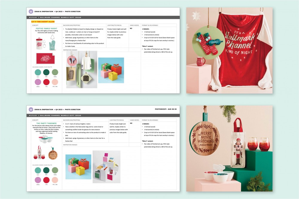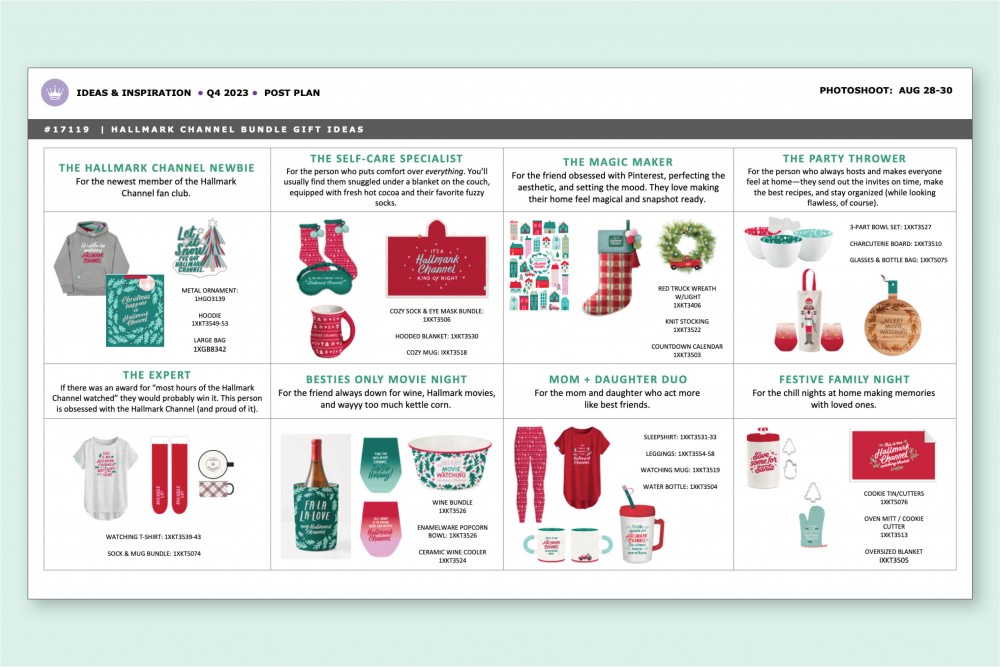 Curated Hallmark Channel focused product into bundles speaking to 8 different types of consumers as a sales tactic. Developed multiple concept options for photo art direction, collaborating with a stylist to bring each vignette to life. The resulting imagery was featured across Instagram, TikTok, and Hallmark’s Ideas & Inspirations blog.